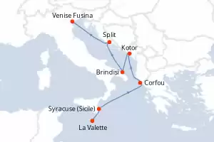 Itinéraire : Barcelone, Naples, La Valette, Syracuse (Sicile), Corfou, Kotor, Brindisi, Split, Venise Fusina