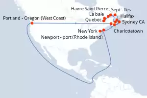 Itinéraire : Quebec, |La baie, Sept - Iles, Charlottetown, Sydney CA, Halifax, Newport - port (Rhode Island), New York, Portland - Oregon (West Coast), Saint John, Iles de la Madeleine, Havre Saint Pierre, Baie-Comeau, Quebec