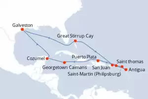 Itinéraire : Galveston, Great Stirrup Cay, San Juan, Antigua, Saint-Martin (Philipsburg), Saint thomas, Puerto Plata, Georgetown, Cozumel, Galveston
