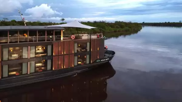Conçu par le cabinet Studio Noor à Ho Chi Minh-Ville, l’Aqua Nera s’inspire des lagunes d’eau noire amazoniennes et joue subtilement sur les contrastes entre ambiance tamisée et touches d’artisanat péruvien, espagnol et portugais. Long de plus de 62 mètres, ce navire au design contemporain et aux lignes épurées affiche une silhouette élégante, conçue pour naviguer avec aisance dans les méandres profonds et peu explorés de l’Amazonie péruvienne. La décoration intérieure, sobre et sophistiquée, rend hommage à la richesse culturelle de la région à travers des clins d’œil aux motifs traditionnels shipibo-conibo, aux carreaux d’Iquitos et aux matières nobles.