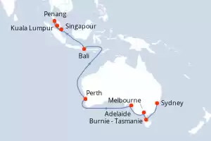 Itinéraire : Sydney, Burnie - Tasmanie, Melbourne, Adelaide, Perth, Bali, Kuala Lumpur, Penang, Singapour