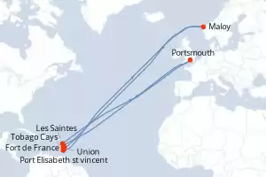 Itinéraire : Fort de France, Port Elisabeth st vincent, Maloy, Tobago Cays, Union, Pigeon Island Beach, Soufriere, Les Saintes, Portsmouth, Fort de France