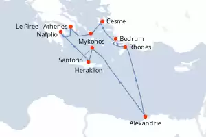 Grèce,Turquie,Egypte Itinéraire: Le Piree - Athenes , Mykonos , Cesme , Bodrum , Rhodes , Alexandrie , Santorin , Heraklion , Nafplio , Le Piree - Athenes , Le Piree - Athenes , Mykonos , Cesme , Bodrum , Rhodes , Alexandrie , Santorin , Heraklion , Nafplio , Le Piree - Athenes Pension Complète Silver Nova 12 jours Suite Le Piree - Athenes 26/09/2027 dès 8500 € Boissons incluses Excursions Incluses Frais de séjour inclus Cuisine Gastronomique Service de Majordome inclus Pension Complète Voir les offres