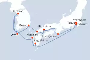 Japon, Corée du Sud Itinéraire: Yokohama , kochi , Hiroshima , Détroit de Kanmon , Busan , Jeju , Incheon , Incheon , Nagasaki , Kagoshima , Shimizu , Tokyo , Yokohama , kochi , Hiroshima , Détroit de Kanmon , Busan , Jeju , Incheon , Incheon , Nagasaki , Kagoshima , Shimizu , Tokyo Pension Complète Silver Moon 15 jours Suite Yokohama 17/10/2026 dès 9000 € Boissons incluses Excursions Incluses Frais de séjour inclus Cuisine Gastronomique Service de Majordome inclus Pension Complète Voir les offres