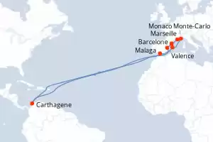 Espagne, Colombie, Monaco, France Itinéraire: Barcelone , Marseille , Monaco Monte-Carlo , Palma de Majorque , Malaga , Malaga , Carthagene CO , Valence , Barcelone , Barcelone , Marseille , Monaco Monte-Carlo , Palma de Majorque , Malaga , Malaga , Carthagene CO , Valence , Barcelone Pension Complète Silver Ray 11 jours Suite Barcelone 29/10/2026 dès 7100 € Boissons incluses Excursions Incluses Frais de séjour inclus Cuisine Gastronomique Service de Majordome inclus Pension Complète Voir les offres