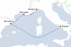 France, Espagne, Italie Itinéraire: Marseille , Barcelone , Naples , Civitavecchia - Rome , La Spezia , Savone , Marseille Pension Complète Costa Toscana 8 jours Cabine standard Marseille 29/11/2025 dès 564 € + dès 1064 € Offre train A/R dès 99€ Enfants Gratuits jusqu'à 18 ans Club Enfants dès 3 ans All inclusive disponible Pension Complète Autres ports d'embarquement : Barcelone Savone Civitavecchia - Rome Autres départs : 13-20-27 déc. 25 Voir les offres