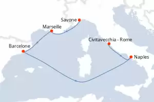 Italie, France, Espagne Itinéraire: Civitavecchia - Rome , La Spezia , Savone , Marseille , Barcelone , Naples , Civitavecchia - Rome Pension Complète Costa Toscana 8 jours Cabine standard Civitavecchia - Rome 03/12/2025 dès 604 € + dès 1124 € Enfants Gratuits jusqu'à 18 ans Club Enfants dès 3 ans All inclusive disponible Pension Complète Autres ports d'embarquement : Barcelone Marseille Savone Autres départs : 17-24 déc. 25 Voir les offres