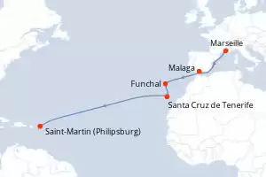 France, Espagne, Madère, Canaries, Antilles, Iles Vierges Itinéraire: Marseille , Malaga , Funchal , Santa Cruz de Tenerife , Saint-Martin (Philipsburg) , Fort de France , Pointe a Pitre , St Kitts , Tortola , Saint Domingue Pension Complète Costa Fascinosa 18 jours Cabine standard Marseille 21/11/2025 dès 1134 € Enfants Gratuits jusqu'à 18 ans Club Enfants dès 3 ans All inclusive disponible Pension Complète Voir les offres