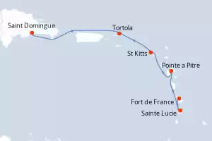 Antilles, Iles Vierges Itinéraire: Fort de France , Pointe a Pitre , St Kitts , Antigua , Tortola , Saint Domingue , Pointe a Pitre , Fort de France Pension Complète Costa Favolosa 9 jours Cabine standard Fort de France 25/11/2026 dès 799 € Supplément single réduit -50% Enfants Gratuits jusqu'à 18 ans Club Enfants dès 3 ans All inclusive disponible Pension Complète Voir les offres