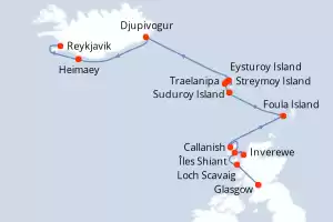 Territoires sauvages d'Écosse, des îles Féroé et d'Islande Itinéraire: Glasgow , Belfast , Oban , Ullapool , Lerwick , Suduroy Island , Streymoy Island , Traelanipa , Streymoy Island , Djupivogur , Heimaey , Iles Surtsey , Reykjavik , Reykjavik Pension Complète Le Laperouse 12 jours Cabine balcon Glasgow 09/07/2026 dès 9980 € Boissons incluses Luxe Francophone Gastronomie Ducasse Conseils Service Majordome inclus Pension Complète Voir les offres