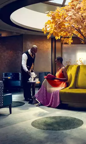 Embarquer avec Cunard, c'est plonger dans une atmosphère imprégnée de l'élégance britannique. Des traditions telles que le thé de l'après-midi, servi par des serveurs en gants blancs, aux soirées de gala dans la somptueuse salle de bal Queens Room, chaque détail est soigneusement orchestré pour évoquer le charme intemporel du Royaume-Uni. Les passagers peuvent également profiter du Golden Lion Pub, véritable pub anglais en mer, proposant des plats traditionnels comme le fish and chips et une sélection de bières, dont certaines spécialement brassées pour la compagnie.