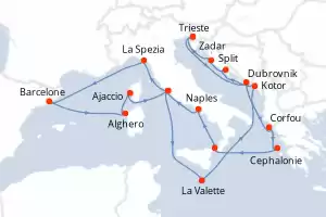 Espagne, Italie, France, Croatie, Monténégro, Grèce, Malte Itinéraire: Trieste , Dubrovnik , Corfou , Cephalonie , Messine (Détroit) , Naples , Civitavecchia - Rome , La Spezia , Ajaccio , Palma de Majorque , Valence , Barcelone , La Valette , Kotor , Split , Zadar , Trieste Pension Complète Queen Elizabeth 22 jours Cabine standard Trieste 06/08/2027 dès 3890 € Room Service 24h/24 Élégance & Raffinement Britanniques Navires de Légende Pension Complète Voir les offres