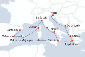 Espagne, France, Italie, Grèce, Croatie Itinéraire: Trieste , Dubrovnik , Corfou , Cephalonie , Messine (Détroit) , Naples , Civitavecchia - Rome , La Spezia , Ajaccio , Palma de Majorque , Valence , Barcelone Pension Complète Queen Elizabeth 15 jours Cabine standard Trieste 06/08/2027 dès 2540 € Room Service 24h/24 Élégance & Raffinement Britanniques Navires de Légende Pension Complète Voir les offres