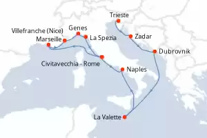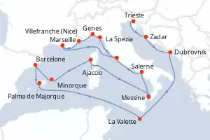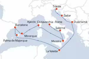 Croatie,Grèce,Espagne,Italie,France,Malte Itinéraire: Trieste , Dubrovnik , Corfou , Cephalonie , Messine (Détroit) , Naples , Civitavecchia - Rome , La Spezia , Barcelone , Alghero , Ajaccio , Civitavecchia - Rome , La Valette , Split , Zadar , Trieste Pension Complète Queen Elizabeth 22 jours Cabine standard Trieste 16/07/2027 dès 3940 € Room Service 24h/24 Élégance & Raffinement Britanniques Navires de Légende Pension Complète Autres ports d'embarquement : Civitavecchia - Rome Voir les offres