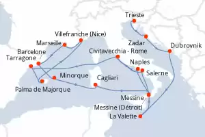 Italie, Grèce, Croatie, Monténégro, Malte, Espagne, France Itinéraire: Trieste , Dubrovnik , Corfou , Messine (Détroit) , Naples , Civitavecchia - Rome , La Spezia , Ajaccio , Palma de Majorque , Valence , Barcelone , La Valette , Kotor , Split , Zadar , Trieste Pension Complète Queen Elizabeth 22 jours Cabine standard Trieste 27/08/2027 dès 3600 € Room Service 24h/24 Élégance & Raffinement Britanniques Navires de Légende Pension Complète Autres ports d'embarquement : Barcelone Civitavecchia - Rome Voir les offres