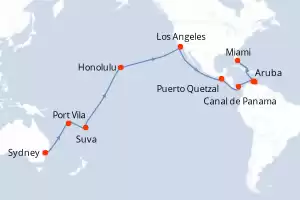 Vanuatu, États-Unis, Pays-Bas, Panama, Guatemala, France, Australie, Fidji (Îles) Itinéraire: Sydney , Port Vila , Suva , Ligne de changement de date , Honolulu , Los Angeles , Los Angeles , Puerto Quetzal , Canal de Panama , Klein Curaçao , Aruba , Miami Pension Complète Queen Anne 35 jours Cabine balcon Sydney 17/03/2026 dès 6590 € Room Service 24h/24 Élégance & Raffinement Britanniques Navires de Légende Pension Complète Voir les offres
