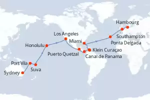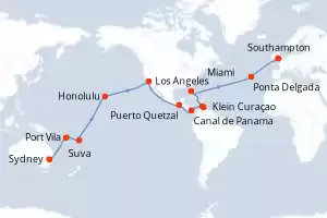 Portugal, Allemagne, Royaume-Uni, États-Unis, Pays-Bas, Panama, Guatemala, France, Australie, Fidji (Îles), Vanuatu Itinéraire: Sydney , Port Vila , Suva , Ligne de changement de date , Honolulu , Los Angeles , Los Angeles , Puerto Quetzal , Canal de Panama , Klein Curaçao , Aruba , Miami , Punta Delgada , Southampton , Hambourg Pension Complète Queen Anne 48 jours Cabine balcon Sydney 17/03/2026 dès 9210 € Room Service 24h/24 Élégance & Raffinement Britanniques Navires de Légende Pension Complète Voir les offres