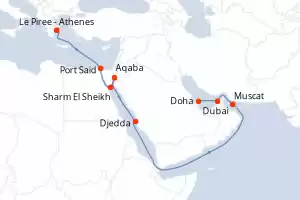 Grèce,Egypte,Jordanie,Arabie Saoudite,Oman,Emirats Arabes Unis,Qatar Itinéraire: Le Piree - Athenes , Port Said , Sharm El Sheikh , Aqaba , Djedda , Muscat , Dubai , Doha Pension Complète Celestyal Journey 15 jours Cabine standard Le Piree - Athenes 14/11/2026 dès 1189 € Boissons incluses aux repas Pourboires inclus Crédit excursions offert Pension Complète Voir les offres