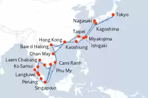Vietnam, Japon, Singapour, Malaisie, Thaïlande, Cambodge, Taïwan, Chine Itinéraire: Tokyo , Kagoshima , Miyakojima , Kaoshiung , Hong Kong , Chan May , Phu My , Singapour , Phu My , Sihanoukville , Laem Chabang , Laem Chabang , Ko Samui , Langkawi , Phuket , Penang , Kuala Lumpur , Singapour , Cami Ranh , Baie d Halong , Baie d Halong , Baie d Halong , Hong Kong , Taipei , Ishigaki , Nagasaki , Tokyo Pension Complète Sapphire princess 43 jours Cabine standard Tokyo 23/01/2027 dès 5094 € Jusqu'à -50% + Jusqu' à 600$ de crédit bord offert Cuisine raffinée Service personalisé Pension Complète Voir les offres