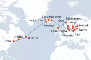 Danemark,Pologne,Lituanie,Lettonie,Estonie,Finlande,Suède,Norvège,Royaume-Uni,Irlande,Canada,États-Unis Itinéraire: Copenhague , Gdansk , Klaipeda , Riga , Tallinn , Helsinki , Nynashamn , Visby , Oslo , Skagen , Copenhague , Lerwick , Stornoway , Belfast , Liverpool , Cobh , Sydney CA , Halifax , Boston Pension Complète Sapphire princess 28 jours Cabine standard Copenhague 07/08/2026 dès 4435 € Cuisine raffinée Service personalisé Pension Complète Voir les offres