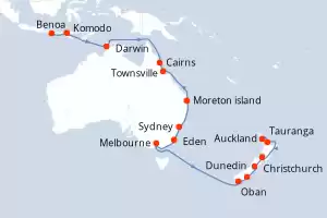 Indonésie,Australie,Nouvelle-Zélande Itinéraire: Benoa , Komodo , Darwin , Cairns , Cairns , Townsville , Moreton island , Sydney , Eden , Melbourne , Melbourne , Oban , Dunedin , Christchurch , Wellington , Tauranga , Auckland Pension Complète Seabourn Quest 32 jours Suite Benoa 04/12/2025 dès 15304 € Restauration raffinée Service personnalisé Pension Complète Voir les offres