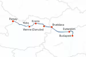 Chez moi sur le Danube Itinéraire: Passau , Vienne , Esztergom , Budapest , Mohacs , Budapest , Bratislava , Pöchlarn , Passau Pension Complète Viktoria 8 jours Cabine extérieure Passau 26/10/2026 dès 924 € Pension Complète Autres départs : 23 mars 26 13-20 avr. 26 11-18-25 mai 26 Autres départs Voir les offres