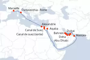 Oman, Egypte, Chypre, Grèce, Malte, Italie, Emirats Arabes Unis, Qatar Itinéraire: Genes , Civitavecchia - Rome , La Valette , Le Piree - Athenes , Rhodes , Limassol , Canal de Suez , Canal de suez (sortie) , Mascate , Doha , Dubai , Dubai Pension Complète MSC World Europa 21 jours Cabine standard Genes 08/11/2026 dès 1610 € Black friday jusqu'à -50% Internet à bord Enfants Gratuits jusqu'à 12 ans Clubs Enfants dès 3 ans Pension Complète Voir les offres