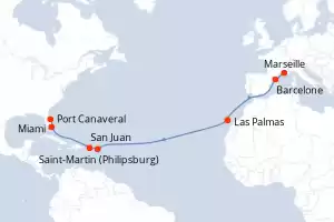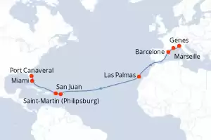 Espagne, France, États-Unis, Porto Rico, Pays-Bas Itinéraire: Marseille , Barcelone , Las Palmas , Saint-Martin (Philipsburg) , San Juan , Miami , Port Canaveral Pension Complète MSC Grandiosa 17 jours Suite Marseille 20/11/2025 dès 5389 € Pension Complète Voir les offres