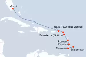 États-Unis,Royaume-Uni,Pays-Bas,France,Sainte-Lucie,Barbade,Dominique,Porto Rico Itinéraire: Miami , Charlotte Amalie , Saint-Martin (Philipsburg) , Saint-Pierre (Martinique) , Castries , Bridgetown , Roseau , Basseterre (St Kitts) , San Juan , Key West , Miami Pension Complète Azamara Onward 15 jours Cabine standard Miami 30/11/2027 dès 3299 € Pension Complète Voir les offres