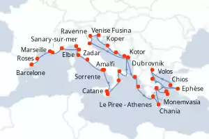 Espagne,France,Monaco,Italie,Monténégro,Slovénie,Croatie,Grèce,Turquie Itinéraire: Barcelone , Roses , Marseille , Sanary-sur-mer , Monaco Monte-Carlo , Florence/Pise (Livourne) , Florence/Pise (Livourne) , Portovenere , Elbe , Civitavecchia - Rome , Sorrente , Amalfi , Catane , Syracuse (Sicile) , Crotone , Tarente , Kotor , Ravenne , Venise Fusina , Venise Fusina , Koper , Zadar , Hvar , Dubrovnik , Kotor , Corfou , Argostoli , Monemvasia , Chania , Le Piree - Athenes , Ephèse , Chios , Thessalonique , Volos , Mykonos , Paros , Mykonos , Le Piree - Athenes Pension Complète Azamara Onward 38 jours Cabine standard Barcelone 13/08/2026 dès 11519 € Black Friday: Jusqu’à 3500€ de remise Pension Complète Voir les offres