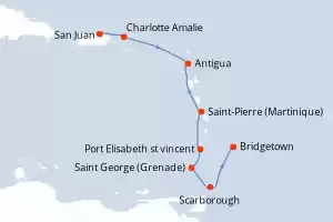 Porto Rico,Royaume-Uni,Antigua-et-Barbuda,France,Saint Vincent-et-les-Grenadines,Grenade,Trinité-et-Tobago,Barbade,Sainte-Lucie,Dominique,Pays-Bas Itinéraire: San Juan , Charlotte Amalie , Virgin Gorda , Antigua , Saint-Pierre (Martinique) , Port Elisabeth st vincent , Saint George (Grenade) , Scarborough , Bridgetown , Castries , Roseau , Basseterre (St Kitts) , Charlestown , Saint-Martin (Philipsburg) , Road Town (Iles Vierges) , San Juan Pension Complète Azamara Quest 16 jours Cabine standard San Juan 06/11/2027 dès 3529 € Pension Complète Voir les offres