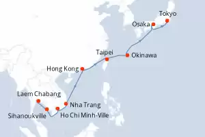 Vietnam, Cambodge, Thaïlande, Japon, Taïwan, Chine Itinéraire: Laem Chabang , Sihanoukville , Ho Chi Minh-Ville , Ho Chi Minh-Ville , Nha Trang , Hong Kong , Hong Kong , Taipei , Okinawa , Osaka , Osaka , Tokyo Pension Complète Seven Seas Explorer 17 jours Suite Laem Chabang 02/03/2027 dès 10869 € Pourboires Inclus Pré-nuit Hôtel Offerte Restaurants de spécialités inclus Service de blanchisserie inclus Excursions illimitées offertes Pension Complète Voir les offres
