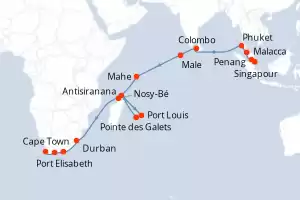Singapour, Maurice, Afrique du Sud, Madagascar, Seychelles, Maldives, Sri Lanka, Thaïlande, Malaisie, France Itinéraire: Singapour , Malacca , Penang , Phuket , Colombo , Male , Mahe , Antisiranana , Port Louis , Port Louis , Pointe des Galets , Nosy-Bé , Durban , Port Elisabeth , Port Elisabeth , Mossel Bay , Cape Town , Cape Town Pension Complète Seven Seas Mariner 32 jours Suite Singapour 28/03/2028 dès 17169 € Pourboires Inclus Pré-nuit Hôtel Offerte Restaurants de spécialités inclus Service de blanchisserie inclus Excursions illimitées offertes Pension Complète Voir les offres