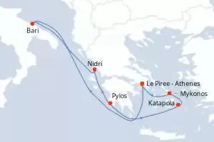 Itinéraire : Le Piree - Athenes, Mykonos, Katapola, Pylos, Nidri, Bari, Le Piree - Athenes