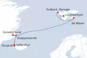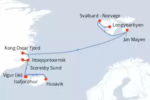 Norvège, Islande, Gröenland Itinéraire: Longyearbyen , Svalbard - Norvege , Svalbard - Norvege , Svalbard - Norvege , Jan Mayen , Kong Oscar Fjord , Kong Oscar Fjord , Kong Oscar Fjord , Ittoqqortoormiit , Scoresby Sund , Scoresby Sund , Scoresby Sund , Vigur (ile) , Husavik , Isafjordhur Pension Complète SH Vega 14 jours Cabine extérieure Longyearbyen 27/07/2026 dès 10550 € Pension Complète Voir les offres