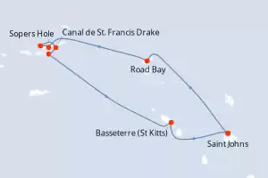 Itinéraire : Saint Johns, Gustavia, Canal de St. Francis Drake, Norman Island, Sopers Hole, Iles Vierges, Spanish Town, Jost Van Dyke, Saint-Martin (Philipsburg), Basseterre (St Kitts), South Friar's - plage, Saint Johns