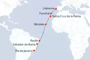 De Lisbonne à Santos Itinéraire: Lisbonne , Cadix , Las Palmas , Santa Cruz de Tenerife , Mindelo , Maceio , Salvador de Bahia , Rio de Janeiro , Santos Pension Complète Costa Diadema 17 jours Suite Lisbonne 07/11/2026 dès 3284 € Enfants Gratuits jusqu'à 18 ans Club Enfants dès 3 ans All inclusive disponible Pension Complète Voir les offres