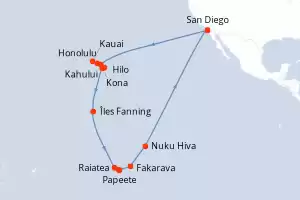 France, Kiribati, États-Unis Itinéraire: San Diego , Kauai , Honolulu , Honolulu , Kahului , Kona , Iles Fanning , Rangiroa , Huahine , Bora Bora , Raiatea , Papeete , Papeete , Bahia D opuncha , Fakarava , Nuku Hiva , San Diego Pension Complète MS Zaandam 36 jours Cabine standard San Diego 15/10/2026 dès 4329 € Cuisine Raffinée Animations à bord exclusives Expérience Premium Pension Complète Voir les offres