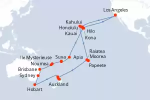 France,Nouvelle-Zélande,Australie,Nouvelle-Calédonie,Vanuatu,Fidji (Îles),Samoa,États-Unis Itinéraire: Los Angeles , Honolulu , Kahului , Kauai , Papeete , Moorea , Raiatea , Auckland , Tauranga , Bay of islands , Hobart , Sydney , Brisbane , Noumea , Ile Mysterieuse , Suva , Dravuni Island , Apia , Hilo , Kona , Los Angeles Pension Complète Island Princess 55 jours Cabine extérieure Los Angeles 13/03/2026 dès 5456 € Cuisine raffinée Service personalisé Pension Complète Voir les offres