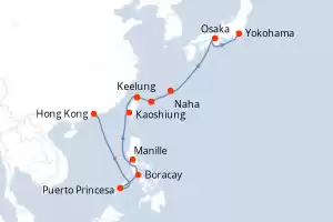 Chine, Japon, Corée du Sud, Taïwan, Philippines Itinéraire: Hong Kong , Puerto Princesa , Boracay , Manille , Kaoshiung , Keelung , Ishigaki , Naha , Osaka , Tokyo , Shimizu , Osaka , Osaka , Kagoshima , Nagasaki , Pusan , Yeosu , Fukuoka , Hiroshima , kochi , Tokyo Pension Complète MS Westerdam 29 jours Cabine standard Hong Kong 14/02/2027 dès 3579 € Cuisine Raffinée Animations à bord exclusives Expérience Premium Pension Complète Voir les offres
